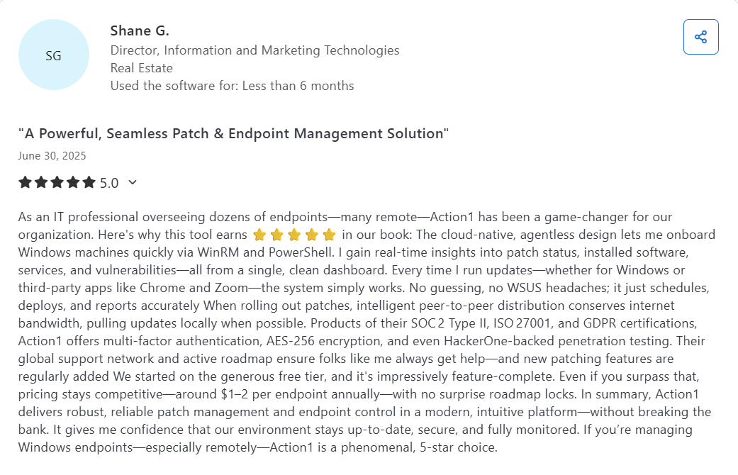 | Action1 | Granular control | Real-time reports | Cloud + remote | Windows, macOS | SOC 2, staging | Free up to 200 |