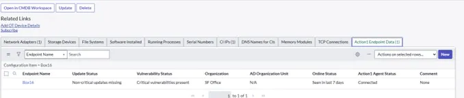 Action1-specific data is stored in a dedicated Action1 Endpoint table linked to the corresponding Computer record. In the CMDB user interface, this information can be exposed as a related list or separate tab on the Computer record, providing immediate visibility into key operational indicators. From there, users can navigate to the Action1 Endpoint record to access additional Action1-specific context, while standard CMDB classes remain unchanged and clean.