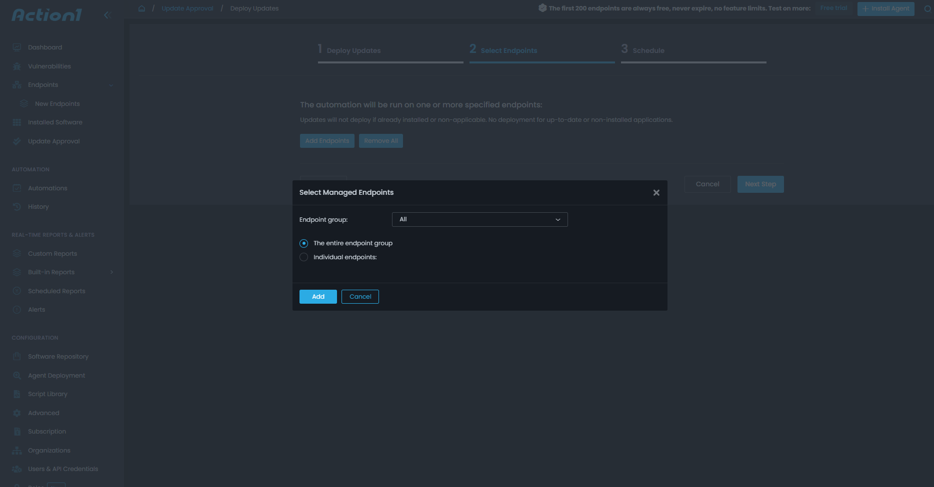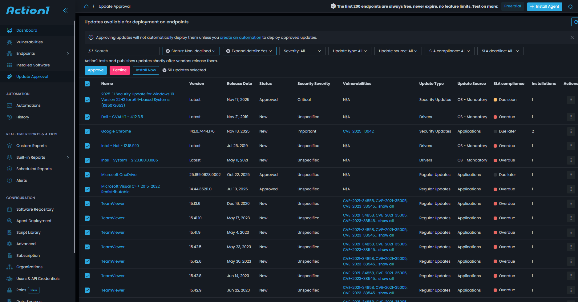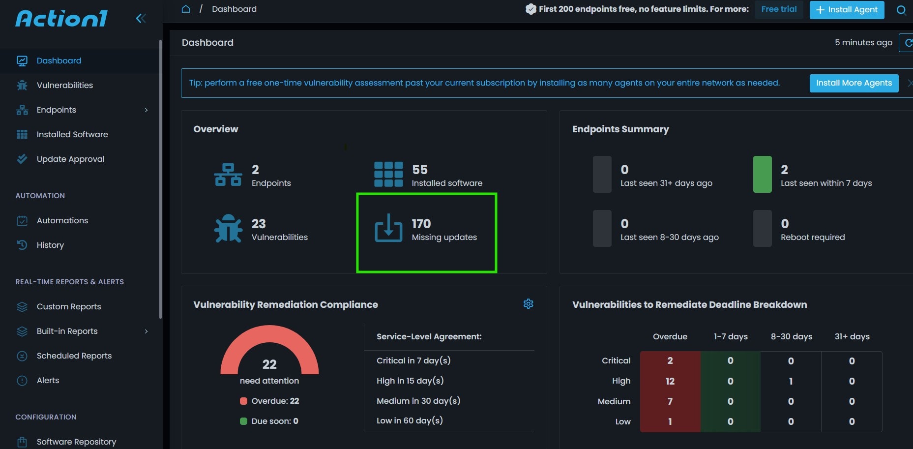 Action1 is an autonomous endpoint management platform trusted by many Fortune 500 companies. Cloud-native, infinitely scalable, highly secure, and configurable in 5 minutes—it just works and is always free for the first 200 endpoints, with no functional limits. By pioneering autonomous OS and third-party patching with peer-to-peer patch distribution and real-time vulnerability assessment without needing a VPN, it eliminates routine labor, preempts ransomware and security risks, and protects the digital employee experience.