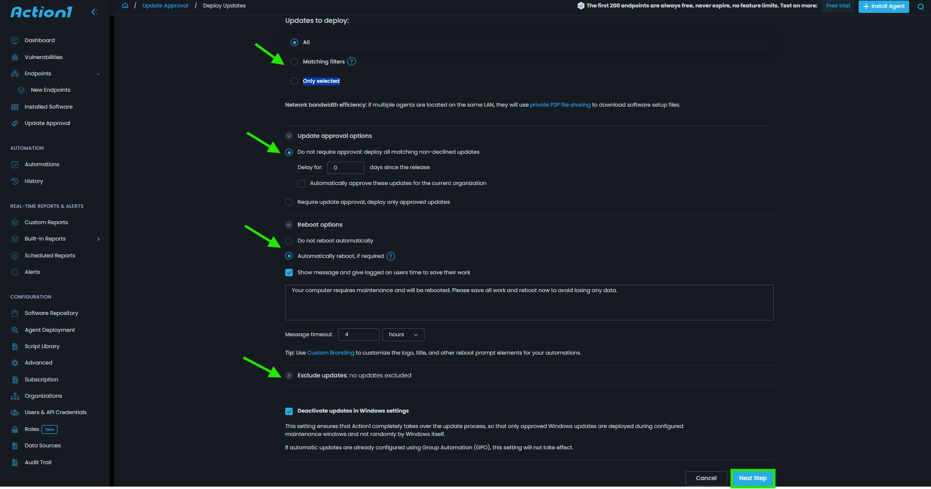 Customize the automation by choosing which updates to deploy, setting update approval rules and reboot options, then click “Next Step.”