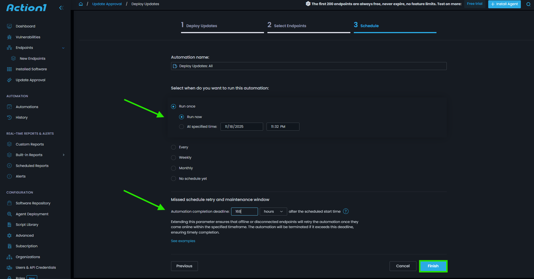 Schedule the deployment based on your preferences. You can run it immediately or set a specific time and date, weekly or monthly. Configure the missed schedule and maintenance window options to ensure disconnected or offline endpoints receive updates as soon as they reconnect. Finally, click “Finish.”
