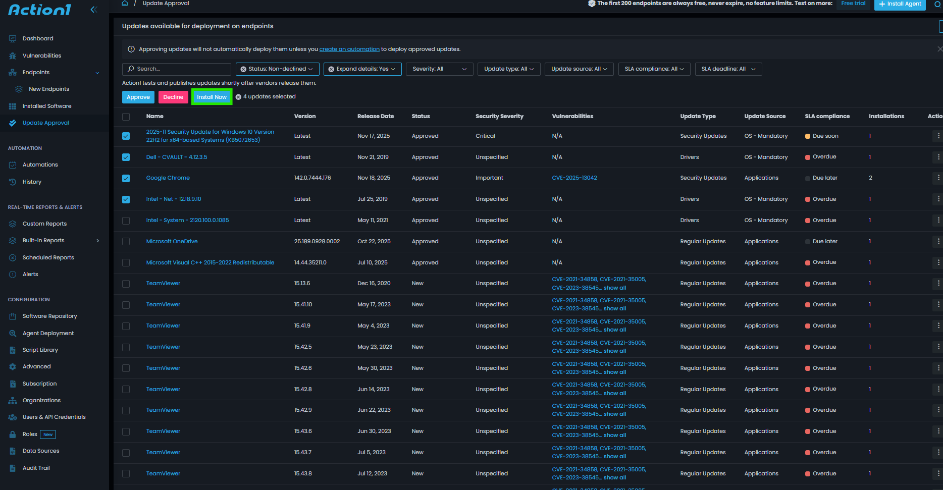 - Deploy updates — Action1 gives you the flexibility to roll out updates immediately by clicking “Install Now”, or schedule automated deployments at a convenient time that fits your organization’s needs. To deploy updates in stages, you can use the “Update Rings” feature, which enables risk-free autonomous rollouts.