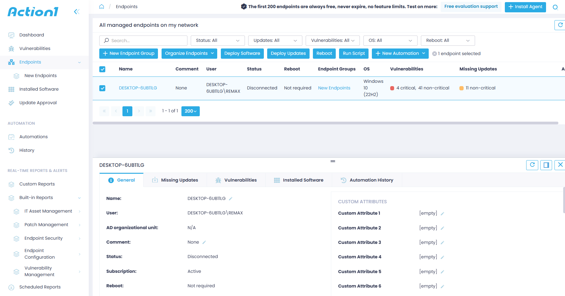 If you are about to use Action1 for the first time, visit the website and create your account. It is completely free for your first 200 servers or endpoints. Once you complete the registration, you will land in the Action1 console, where patch automation starts, and vulnerabilities vanish.